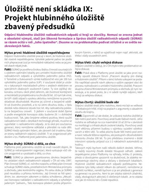 „SÚRAO … čelí trvalému tlaku ze strany radikálních odpůrců úložiště. Ti se zorganizovali především v tzv. Platformě proti hlubinnému úložišti.“